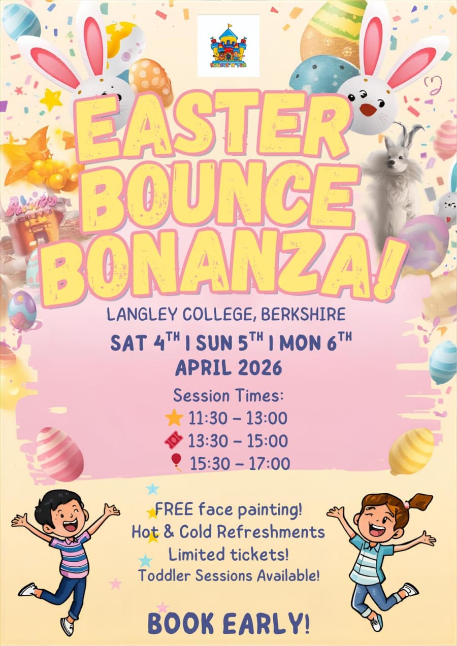 Secure your child's spot at the Easter Bounce Bonanza - Child ticket event at Langley College. This family-friendly event runs Saturday 4th, Sunday 5th & Monday 6th April 2026. Sessions run at 11:30–13:00, 13:30–15:00 and 15:30–17:00. Parents and adults go free, so kids can bounce, slide and play while adults relax. 🎈🏰